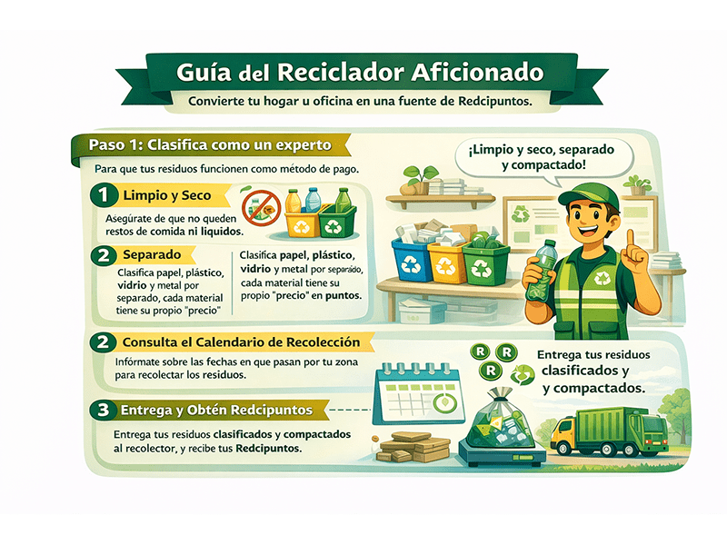 • Separado: No mezcles papel con plástico. Cada material tiene su propio «precio» en puntos.